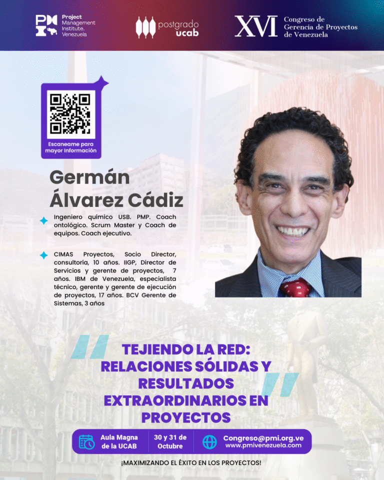 El XVI Congreso Internacional de Gerencia de Proyectos incluye en su agenda la ponencia de Germán Álvarez Cádiz, titulada “Tejiendo la Red: Relaciones Sólidas y Resultados Extraordinarios en Proyectos”.