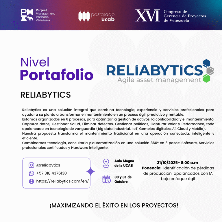 El PMI Capítulo Venezuela da la bienvenida a Reliabytics como patrocinante Nivel Portafolio del XVI Congreso de Gerencia de Proyectos, que se llevará a cabo los días 30 y 31 de octubre de 2025 en el Aula Magna de la Universidad Católica Andrés Bello (UCAB).